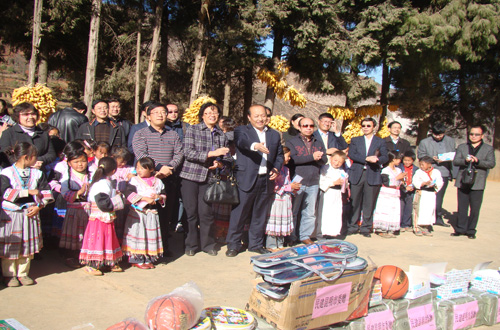 中午,民建企业家们放弃了事先安排的午休,经过仅二、三十公里距离,却一个多小时车程漫天尘土飞扬地颠簸,来到禄劝县翠华乡汤郎箐小学参观。汤郎箐小学的师生们身着盛装,用隆重的民族礼仪,热情迎接民建企业家们。目睹师生们艰苦的学习、生活条件,民建昆明市委向学校赠送了文体用品。昆明桑普阳光技术有限公司总经理许自民听说学校师生长年只能用冷水洗澡的情况后,立即表示捐赠太阳能设备一套。云南富邦基业有限公司董事长赵先代表民建企业,捐资100万元用于援建禄劝学校项目建设。