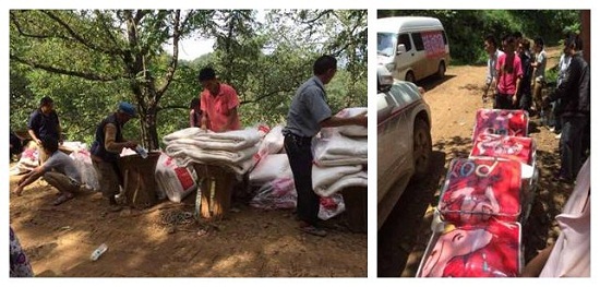 虽然树茶村距离“孤岛”——红石岩村较近,但由于这段道路尚未打通,若依靠人力背进去,至少也需要2.5小时才能抵达,车进不去。经过协调,在昭通市委统战部、民建昭通市委、巧家县统战部的配合下,由民建会员企业提供3辆小型货车,将1000床棉被、500床毛毯分别运至距离红石岩村辖属10个村民小组最近的道路上,按照每村实际农户数量、每户家庭人口数量分配物资(以5口之家为例,基本可领到2床棉被、1床毛毯),由包谷垴乡政府通知红石岩村及其村民小组组长带领村民前来领取棉被和毛毯。据了解,这是
