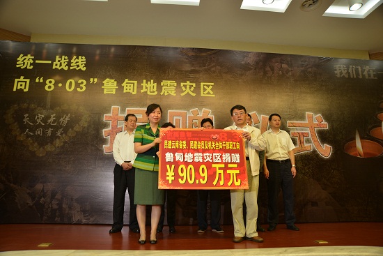 永盈彩票副主委杨先明代表永盈彩票机关工作人员、民建会员、云南同行公益基金会向鲁甸地震灾区爱心捐赠90.9万元。