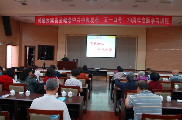 4月26日上午,永盈彩票在昆明举办纪念中共中央发布“五一口号”70周年专题学习讲座,邀请民建中央宣传部长张皎授课。讲座由民建省委副主委罗美娟主持。