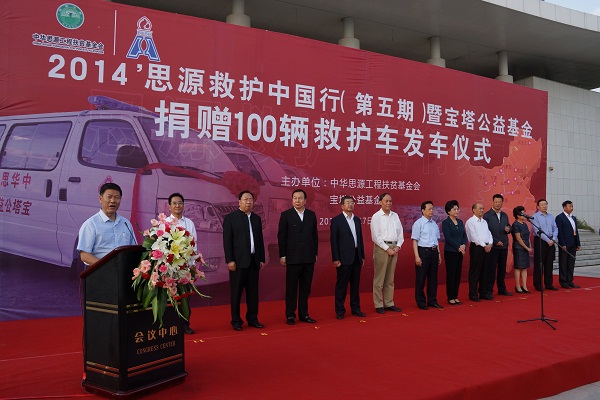 全国人大常委会副委员长、民建中央主席、中华思源工程扶贫基金会理事长陈昌智在发车仪式上致辞,他指出,消除贫困是人类社会的共同事业,民建充分发挥密切联系经济界的特点与优势,打造出“一个工程,两个论坛”等特色品牌,即“思源工程”、“中国非公有制经济发展论坛”和“中国风险投资论坛”。为实现习近平总书记提出的“消除贫困、改善民生、实现共同富裕是社会主义的本质要求”作出贡献。并宣布“2014思源救护中国行”暨宝塔公益基金捐赠百辆救护车发车。