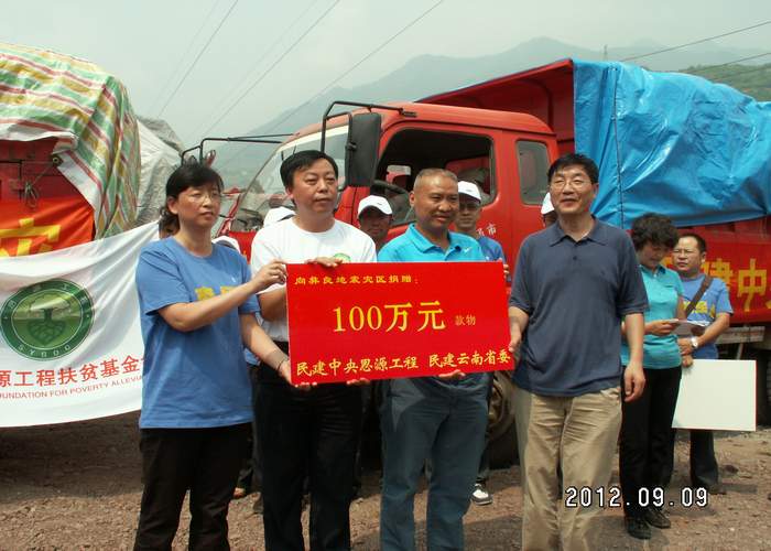 2012年9月9日11:38分,民建中央及永盈彩票100万元救灾款物连夜送抵昭通彝良地震灾区。