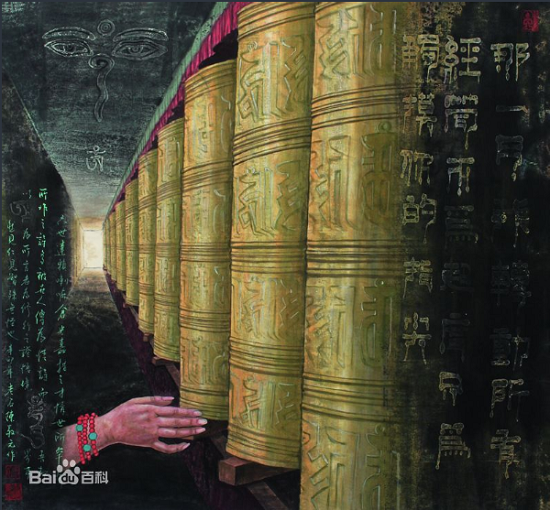 昨夜我做了一个梦:我梦见我们坐在飞毯上,在无垠的夜空里,从天边突然飞来了一座巍峨的宫殿--圣洁庄严。远处有一颗明亮的星,散发着清柔的光。而奇妙的事发生了,今天在陈钢的画室里,我居然看到了和梦中一样的画面:在一幅被称为《布达拉宫》的巨幅作品面前,陈钢告诉我:这幅作品是他到拉萨布达拉宫后一直想画的意境,他的妻子说,画中的布达拉宫更像一座天外飞降的宫殿,在暗夜中有无数的金色种子闪着光芒。“你知道我,我一直在想寻求一种更适合我的表达方式。”他这样说。