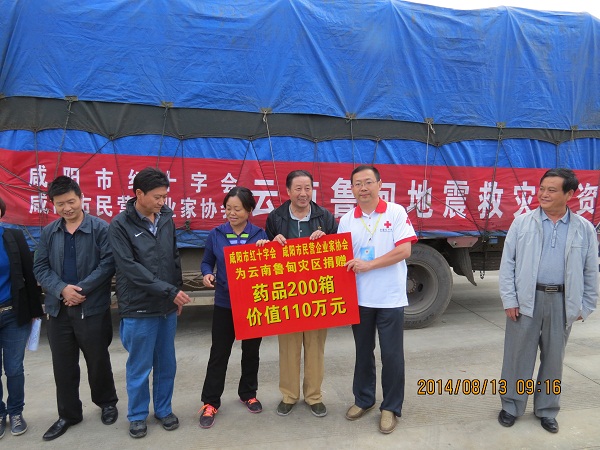 8月11日,满载着咸阳民建会员、民营企业家深情厚谊的价值110万元捐赠药品,在咸阳市民营企业家协会会长郑勇护送下,从咸阳起程奔赴云南,于13日送达鲁甸地震灾区。