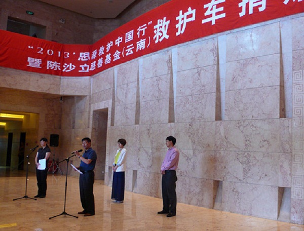 为进一步提高老、少、边、穷地区医疗急救能力,改善群众的就医条件,由“思源工程”主办,永盈彩票会、“思源·陈沙立慈善基金”承办,北汽福田汽车股份有限公司协办的“2013思源救护中国行”于6月9日在北京正式启动,首批由爱国华商陈沙立捐赠的100辆救护车从当日起,分别奔赴河北、天津、云南、新疆、西藏等