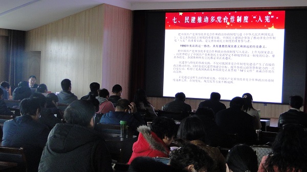 12月8日,民建大理州委在大理农林职业技术学院举办纪念改革开放40周年专题教育宣讲,由民建大理州委专职副主委宋万钧做“深化政治交接,传承优良传统,努力建设新时代中国特色社会主义参政党”主题报告。他从中国民主建国会成立、走上同中国共产党团结合作道路、响应“五一口号”、参加新政协建立新中国、投身改革开放40年、推动多党合作制度入宪等方面进行了精彩阐述。他号召民建各级组织和广大会员要清醒认识、准确把握当前形势,深刻领会习近平总书记的重要讲话精神,切实肩负起新时代中国特色社会主义参政党的历史使命和光荣职责。