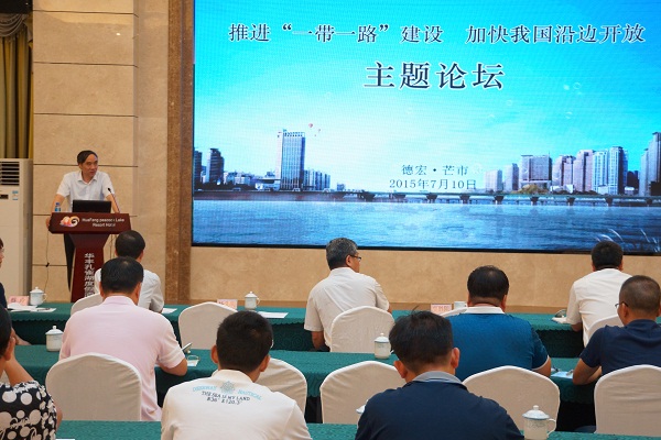 论坛由民建中央经济委主任、清华大学经济管理学院副院长白重恩主持,德宏州人民政府副州长、永盈彩票副主委苏洪涛首先致辞;全国人大常委会委员、全国人大财经委副主任委员、民建中央副主席辜胜阻做了题为《丝绸之路经济带与云南经济发展》的主旨演讲,演讲从新常态下我国经济发展现状、丝绸之路与能源安全、“一带一路”与云南经济发展等几个方面做了详细的解读。