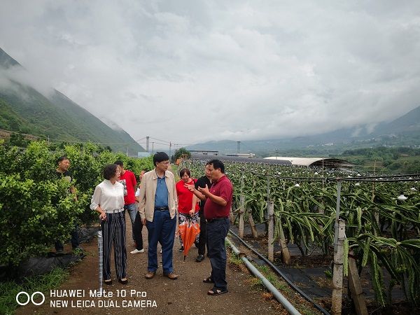 经济支部委员、兴邦农业负责人朱跃兴向马副主委介绍说:公司成立于2014年4月,通过政府招商引资,5月份开始在潞江镇江东村进行土地流转,当时江东村是全省挂名的重点贫困村,全村有立卡贫困户210户,所在的白岩小组就有107户,征地前土地处在半荒芜状态,主要种植农作物就是甘蔗与玉米,年土地平均收入亩产值低于500元,又因严重缺水,村民饮用水都困难,庄稼更是靠天吃饭。公司进驻后,首先找水源,花了300余万元架设了一条10公里左右的引水管道,从而解决了白岩村人畜饮水问题。前后在白岩村流转土地2000余亩,其中立卡贫困户1000余亩的。根据江东村的实际情况,公司本着“公司要发展、农民先致富”的发展理念,捋出了从4个方面提高农户的收入:一是土地收入。每年每亩地租金平均在650元,公司每年支付租金120万元以上,从而保证了农户的土地经济收入。二是工资收入。引领农户与立卡贫困户到公司务工,公司有长期种植承包户93户,其中立卡贫困户35户,年工资在27000-30000万元左右;参加公司中层管理人员12人,年工资在36000—60000元之间;公司还有300多名普通的基地建设工人,一般最低的年工资也在27000—30000元以上;火龙果成熟采收时需要招收大量短工来进行分拣包装工作,每年都有200多人参与分拣工作。公司每年需要支付给江东白岩村百姓几项费用合计695万元左右。三是副业收入。公司每年收购所有农户的农家肥1500吨作为公司有机肥的原料,每吨在300元左右,合计支付45万元左右,农户可以在农闲时收集农家肥增加收入。四是集体经济收入。江东村集体以涉农统筹整合资金20万元入股兴邦农业,签订投资合作协议书,协议规定每年固定分红2万元,用以壮大集体经济。五年的持之以恒,公司不仅仅在提高村民的收入是下足了功夫,还定期组织员工从思想上、技术上进行培训,使江东村的村民素质、技术技能得到了很大提高,公司和农户建立起了温馨和谐的合作共赢关系。