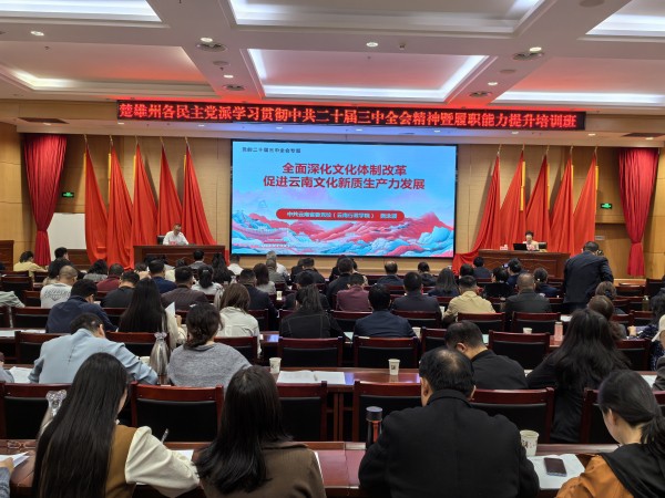 10月18日至20日,民建楚雄州委与民革楚雄州委、民盟楚雄州委、民进楚雄州委、农工党楚雄州委、九三学社楚雄州委、致公党楚雄市基层委在楚雄市社会主义学院联合举办学习贯彻中共二十届三中全会精神暨履职能力提升培训班。