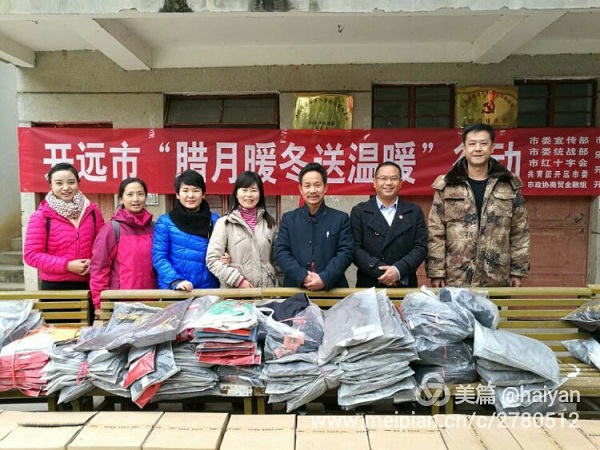 1月13日, 民建会员、开远民间公益社团社长陶毅组织有关人员,联合市红十字会等多部门,将收集到的社会各界捐款16600元,购买了80桶食用油、300件衣裤,到开远市乐白道办事处怡里村委会开展“暖冬送温暖”活动,看望了80多户困难群众。