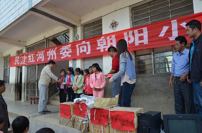 11月12日,民建红河州委到红河县宝华乡朝阳小学开展助学捐赠活动,向学校学生赠送了250本《新华字典》及400本课外读物—《弟子规》,并将募集来的一台IBM电脑捐赠给该校作办公之用。学校于当日下午举行了捐赠仪式,民建州委领导、州政协驻村新农村建设指导员、宝华乡领导及朝阳小学的全体师生参加了捐赠仪式。