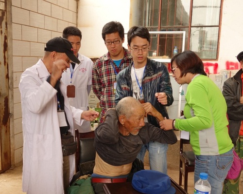 台湾屏基医院贾力耕博士夫妇带领的57名义诊医务人员,是来自台湾屏基医院、北京首都医北武警总院、武汉协和医院、华西医科大、北医大、上海医北医院医生,以及来自北医大、首医大、成医大、贵阳医学院、温州医学院等的在读大学生自愿者。他们从祖国的四面八方,千里迢迢聚集昆明,又冒着小雨赶路,踏着暮色,来到了偏僻的三转弯苗族村。