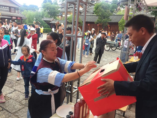 7月6日至7日,由丽江市委统战部指导、中国民主建国会丽江市支部委员会主办的“同心圆·丽江情”助力脱贫攻坚义演义卖活动在丽江古城玉河广场举行。此次活动为期两天,采取义演与义卖相结合、公益与娱乐相融合的形式,部分爱心企业捐赠了螺旋藻、鲜花饼、矿泉水、消费代金券等丽江旅游特色产品,义卖筹集到的资金将全部用于定向帮扶深度贫困村宁蒗县烂泥箐乡大二地村,助力该村脱贫攻坚。