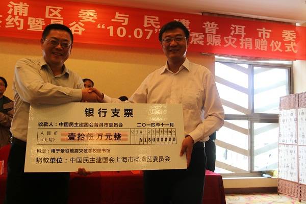会上,徐雪峰主委代表杨浦区委向普洱市景谷地震灾区学习图书馆建设捐赠15万元人民币和书籍,童书玮代表民建普洱市委接收捐赠。