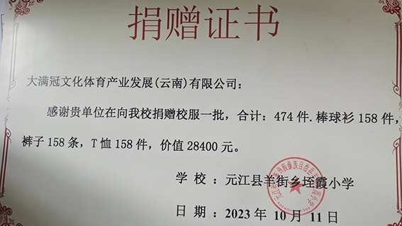 当天,大满冠文化体育产品发展(云南)有限公司向垤霞小学捐赠价值2.84万元的校服474件,受到垤霞村村民和学校师生的热烈欢迎和一致好评。