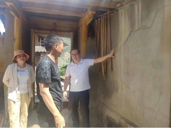 之后,调研组来到沙河五组民建玉溪市委机关干部联系户家中走访座谈,对联系户的生产生活情况进行了深入了解,对存在的困难提出解决办法。在调研过程中,对沙河五组因玉楚高速易门铜厂段隧道施工导致整村民房不同程度的出现开裂,以及后山山体出现较大裂缝等问题进行了实地查看,并就防止房屋进一步开裂形成危房及防范有可能出现的山体滑坡等问题与村、组领导交换了意见,建议村委会尽快向铜厂乡政府及易门县相关部门汇报,拿出切实可行的解决办法,防止地质灾害进一步扩大,对村庄及人员造成危害。