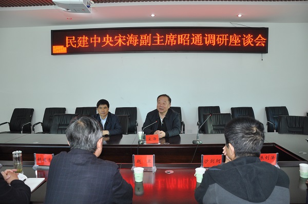随后,民建昭通市委召开座谈会。座谈会上,赵卫主委向宋海汇报了民建昭通市委成立以来开展工作的情况。宋海副主席表示借这次全国政协组织的视察工作的机会来到昭通,和大家在一起座谈和交流,通过听取汇报,对民建昭通市委开展的工作表示满意和肯定,在今后的工作中,要充分做好自身建设工作,主要做好思想建设和组织建设工作,这样才能充分调动广大会员的积极性,提高民建组织的凝聚力,才能在社会服务、参政议政、招商引资等方面做好成绩,树立起民建的良好形象。要借民建昭通市委2017年换届工作之机,做好政治交接工作,将民建的优良传统继续发扬光大。