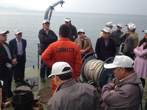 会后会员乘坐游艇参观抚仙湖水下遗址科考现场。